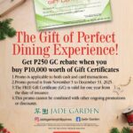 Minimum total dine-in food bill of P5,000. Maximum discount of P5,000.