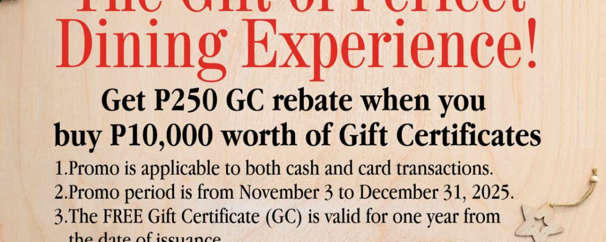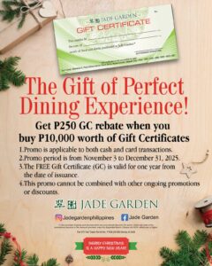 Delight your friends and family with a Jade Garden Gift Certificate this festive season! From November 3 to December 31, 2025, receive a ₱250 rebate for every ₱10,000 worth of gift certificates purchased.